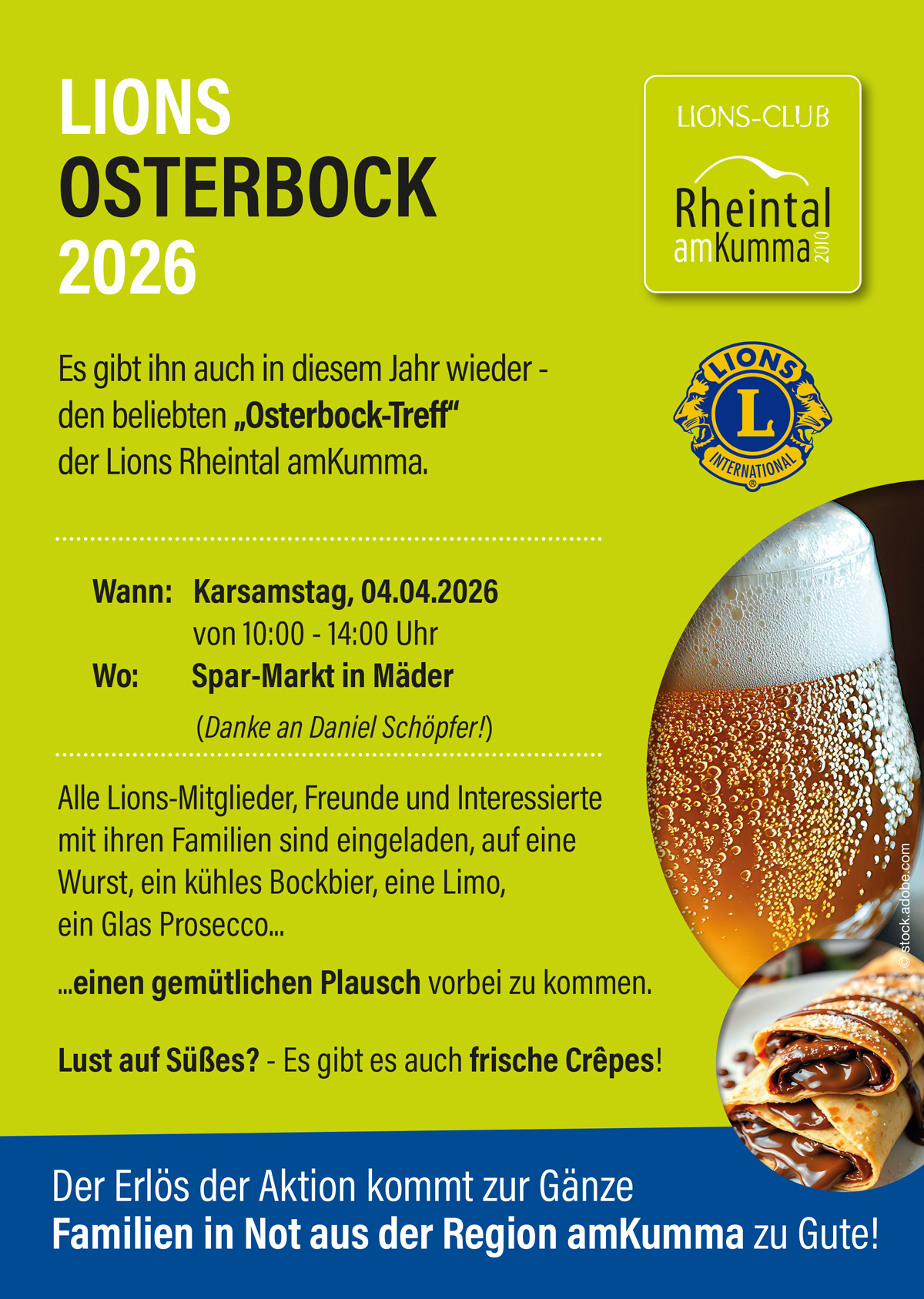 Auch heuer führen wir unsere bereits zur Tradition gewordene OSTERBOCK-Aktion in Zusammenarbeit mit dem SPAR-MARKT in Mäder durch und freuen uns, Sie am Samstag, 04.04.2026 von 10:00 bis 14:00 Uhr mit Bier, frisch gegrillten Würsten, Limo, Prosecco – und auch wieder mit süßen Crepes verwöhnen zu dürfen – vor allem freuen wir uns auf einen kleinen Plausch mit Ihnen.